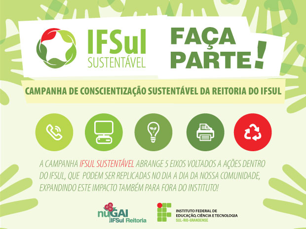 A campanha IFSul Sustentável abrange 5 eixos voltados a ações dentro do ifsul, que podem ser replicadas no dia a dia da nossa comunidade, expandindo este impacto também para fora do instituto!