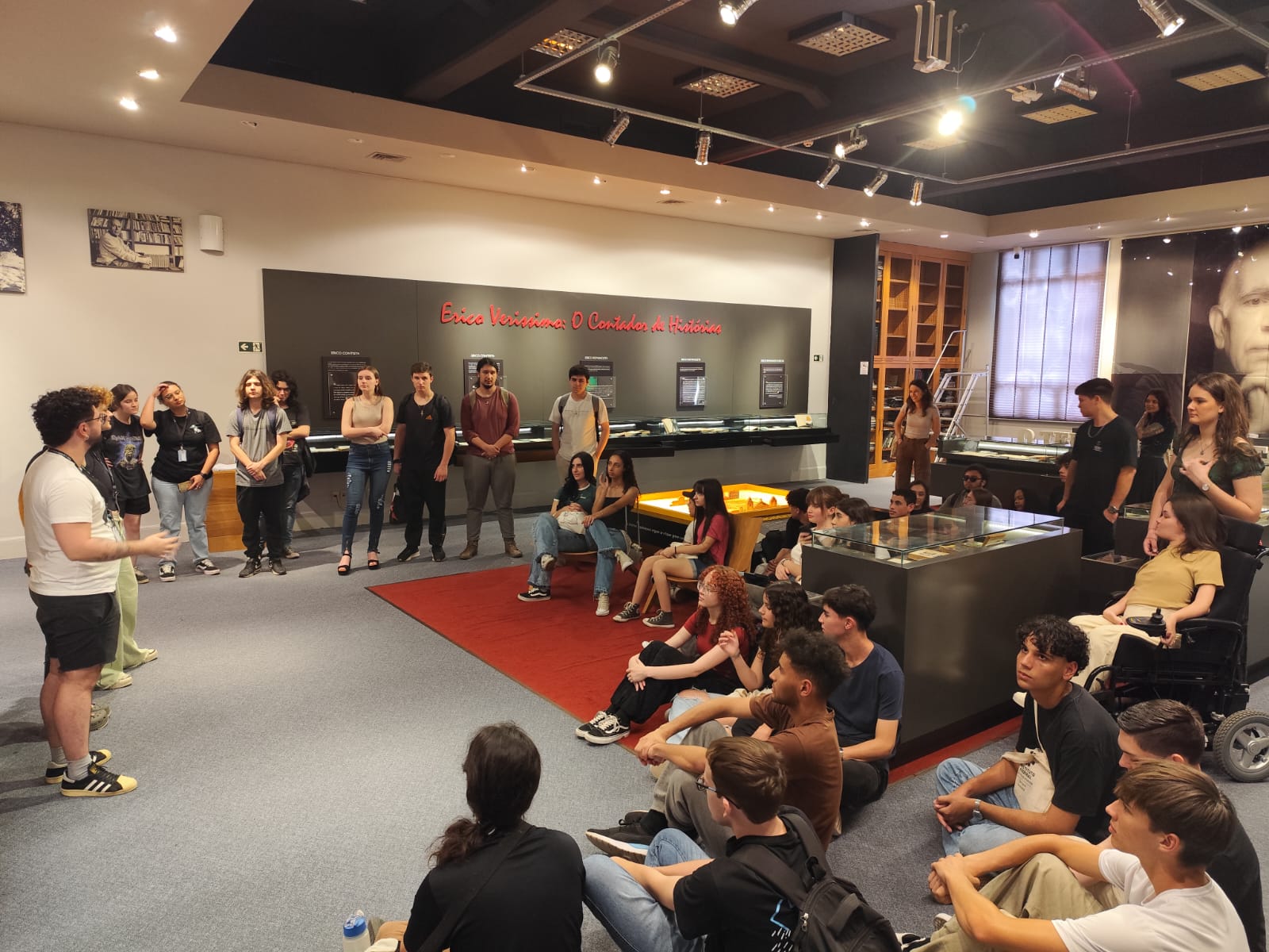 Além da visita aos estandes da Feira, os/as alunos/as participaram de uma visita guiada à exposição “Erico”, no Espaço Força e Luz. A mostra celebra os 120 anos de nascimento de Erico Verissimo, um dos maiores nomes da literatura brasileira. Ao longo do percurso, tiveram a oportunidade de conhecer mais sobre a vida e a obra do autor, sua relevância para a literatura e os contextos históricos presentes em seus livros.