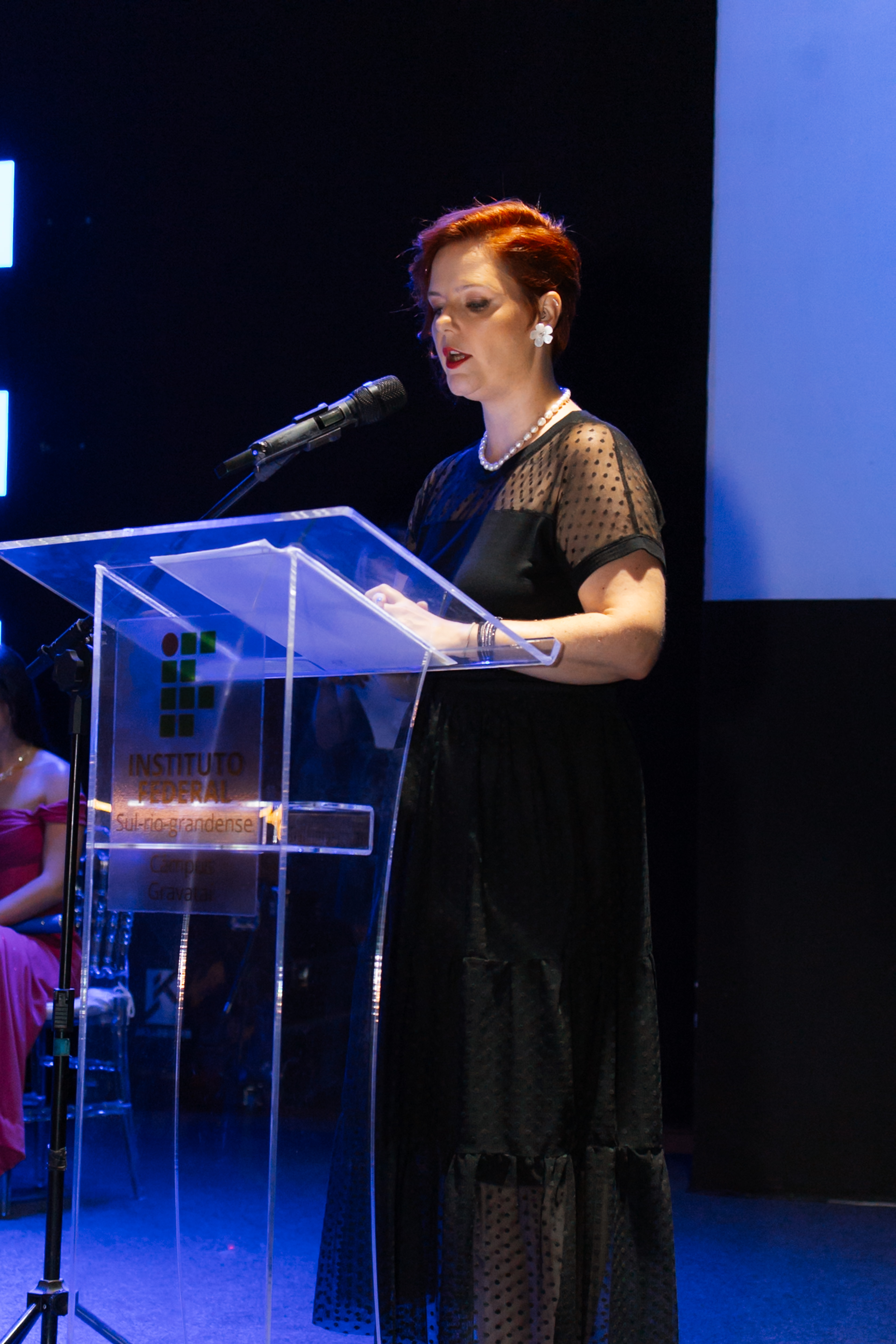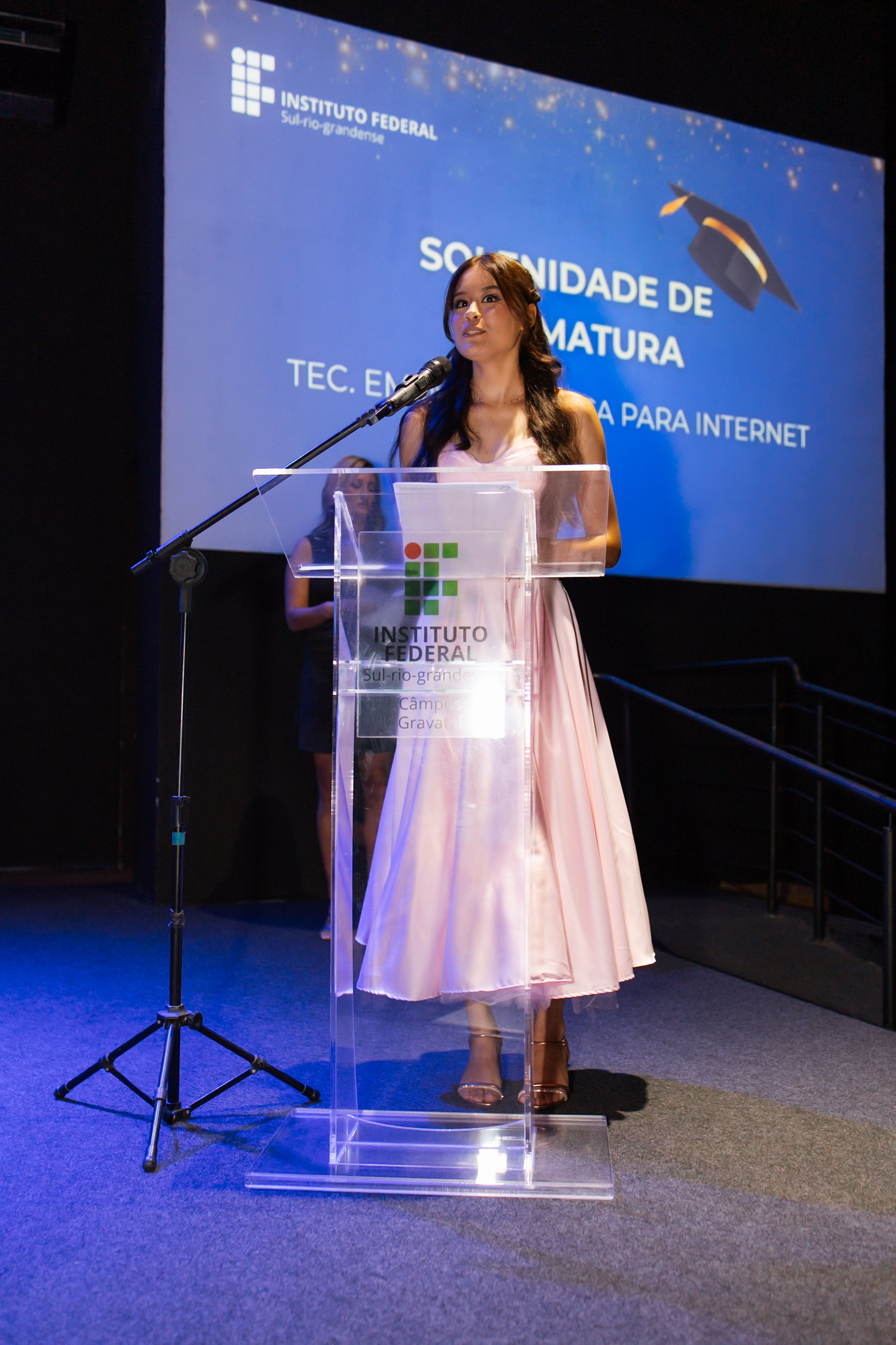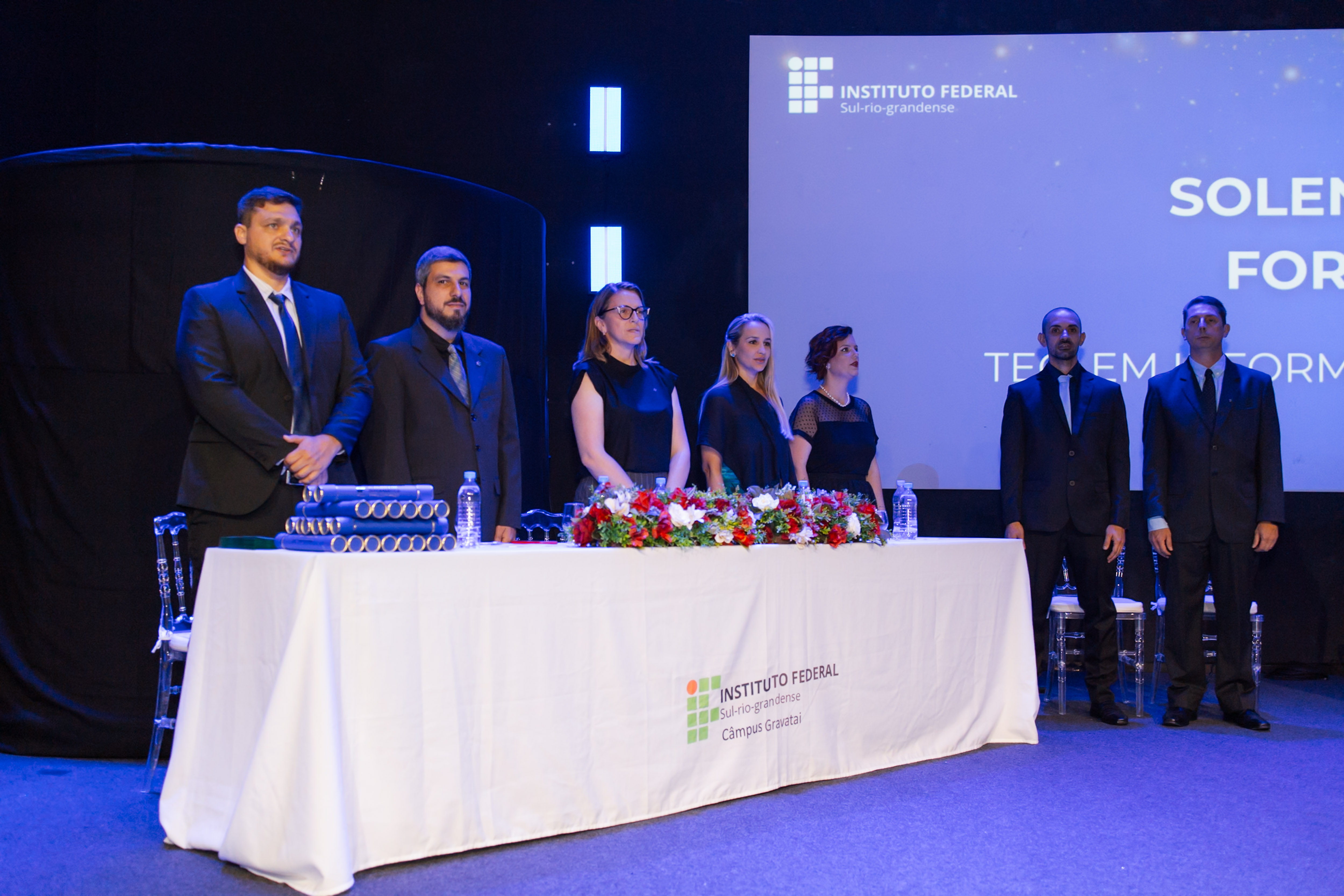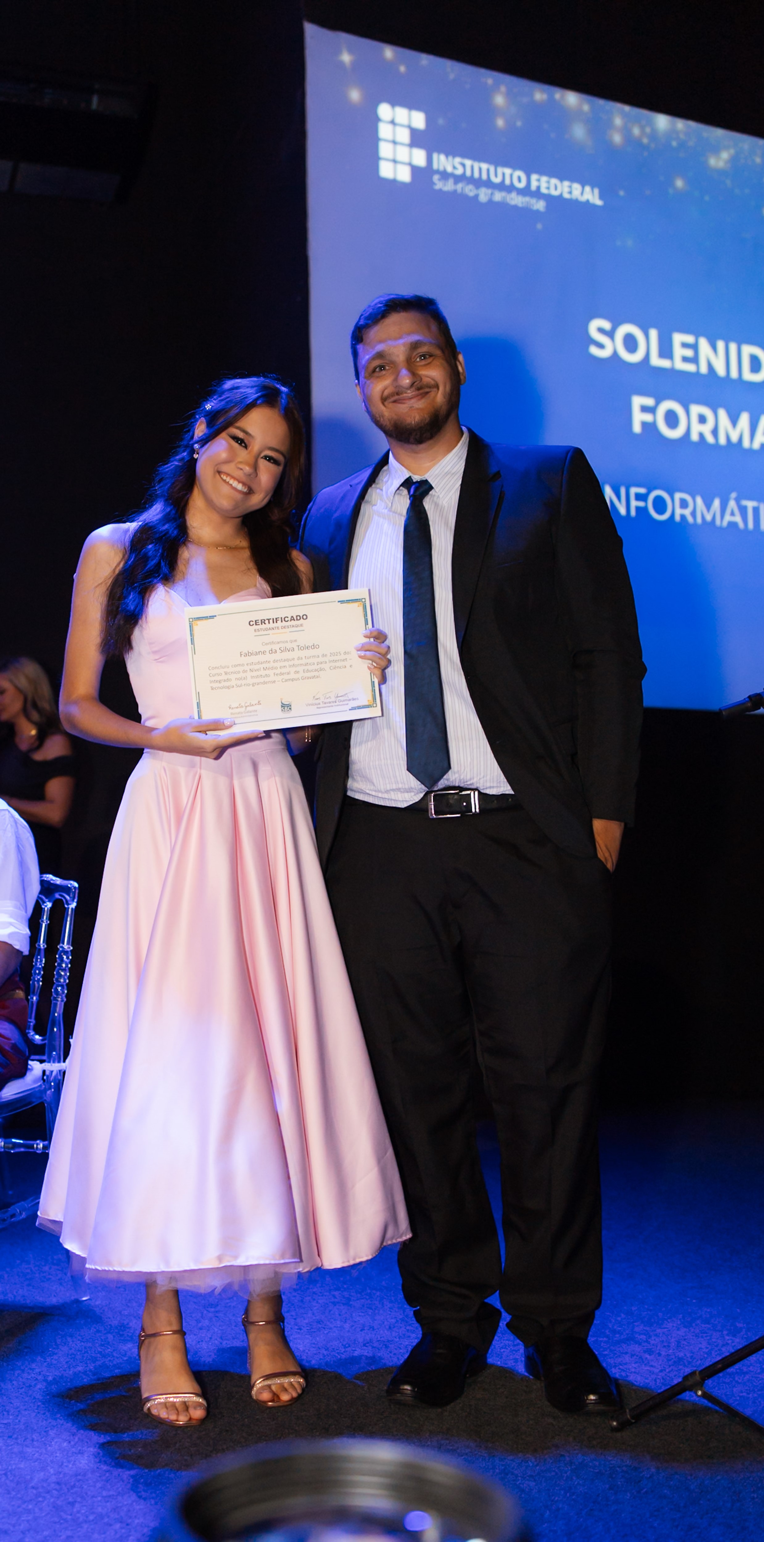 No dia 07 de fevereiro, no auditório da igreja dos Vales ( iVales ), em Gravataí, realizou-se a cerimônia de formatura do Curso Técnico em Informática para Internet, integrado, do câmpus Gravataí, ano 2025. Compondo a mesa solene a pró-reitora de ensino da reitoria, professora Fabíola Mattos Pereira, presidiu a seção em representação ao Magnífico Reitor do Instituto Federal Sul-Rio-Grandense, professor Carlos Jesus Angnoni Correa, sendo, também, composta pelo diretor-geral do Câmpus Gravataí, professor Fernando Abrahão Afonso, a chefe do Departamento de Ensino, Pesquisa e Extensão, professora Michele Lermen, o Coordenador do Curso, professor Felipe Leivas Teixeira e a paraninfa, professora Bianca Deon Rossato. A noite foi repleta de surpresas e momentos sublimes que emocionaram o público presente. Em seus discursos as formadas Fabiane Toledo e Carolina Tadiotto compartilharam vivências, desafios, alegrias, experiências e manifestaram o reconhecimento daqueles(as) que, de alguma forma, contribuíram para o alcance desta vitória. Os homenageados deste ano foram professores Roger da Silva Machado e Fábio de Oliveira Dias sendo agraciados com singela lembrança e leitura de mensagem por formados e formadas que representaram suas turmas. Durante a homenagem foi feita a apresentação musical, em violino, pela formada Melyssa Tomas, abrilhantando o momento. Foi premiada a formada Fabiane da Silva Toledo, com a certificação, entregue pelo Coordenador do Curso, professor Felipe Teixeira, de Estudante Destaque por ter alcançado o maior coeficiente de rendimento ao longo dos quatro anos de curso. Este prêmio agracia os(as) melhores estudantes na área da computação no país e foi instituído pela Sociedade Brasileira de Computação (SBC). Em seus discursos a paraninfa, professora Bianca, o diretor-geral, professor Fernando Afonso e a Pró-reitora Fabíola Pereira destacaram, a superação, resiliência, dedicação e perseverança de cada formado e formada, conquistando mais esta etapa em suas vidas e a importância do apoio dos familiares e mestres nesta jornada.